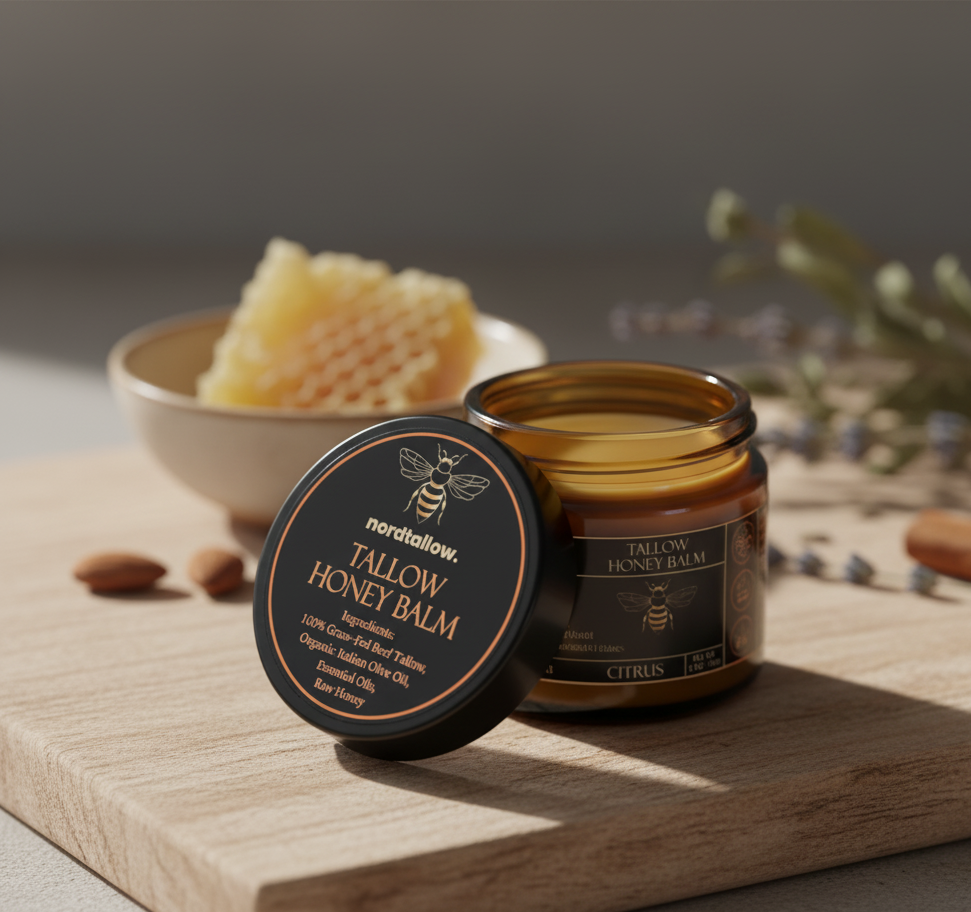 Det är därför vi skapade vår Tallow Honey Balm: en ren blandning av gräsbetad talg och gyllene honung som ger din hud nytt liv – mjuk, len och djupt återfuktad.